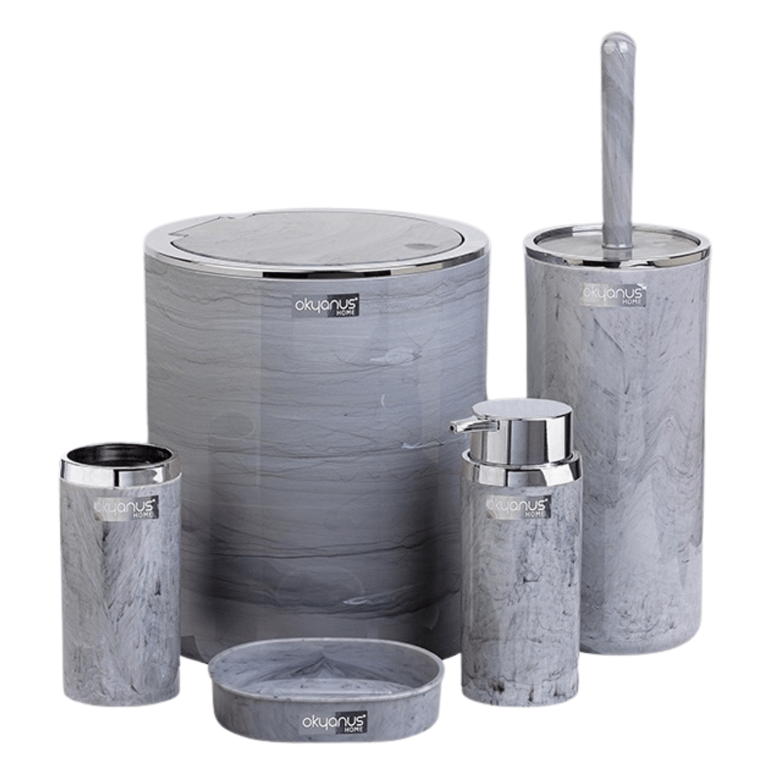 - تتضمن مجموعة إكسسوارات الحمام هذه كل ما تحتاجه لتنظيم حمامك: 1 × سلة مهملات، 1 × فرشاة مرحاض، موزع صابون سائل، 1 × فرشاة أسنان ومعجون، 1 × موزع صابون جاف.