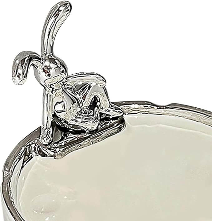 Silver porcelain soap holder with bunny figurine, perfect for stylish bathroom or kitchen decor.