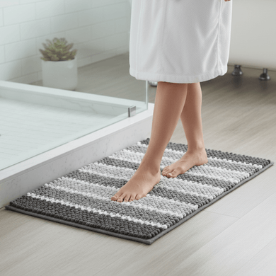 Absorbent Luxury Chunky Chenille Bathroom Rug (45x75cm - 440 grams) | Ultra-Soft & Absorbent Non-Slip Bath Mat | Grey & White Stripe