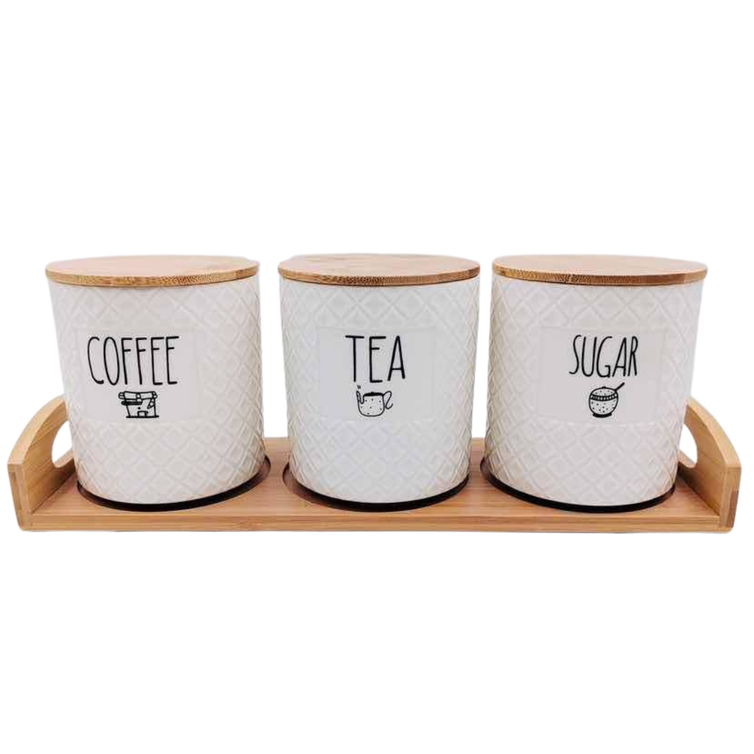 📦 Set Includes: 3 ceramic canisters + bamboo tray