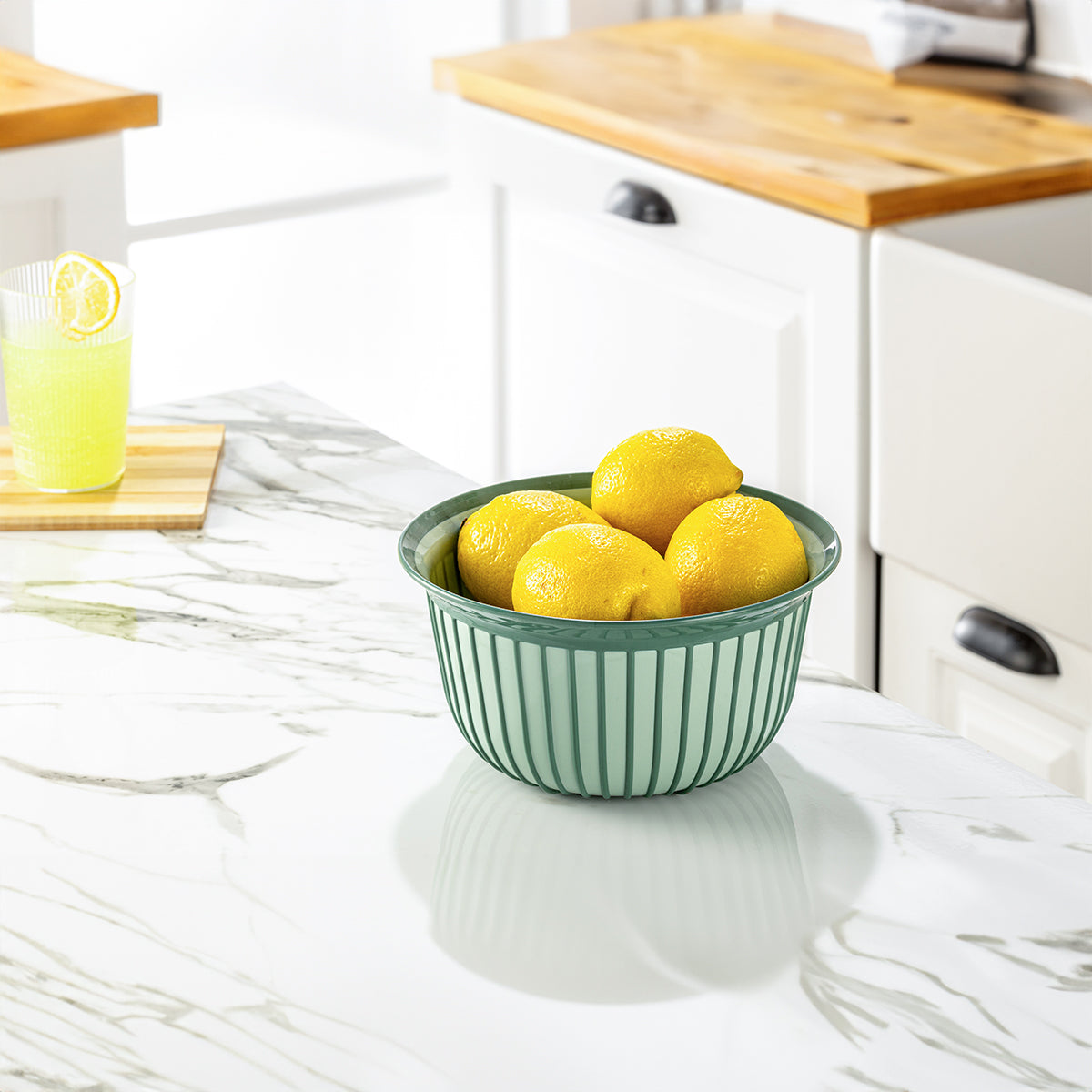 Bowls - Multi Purpose Linea Round Mixing Bowl - ( 2000 ml ) filled with fresh lemons on a marble countertop.